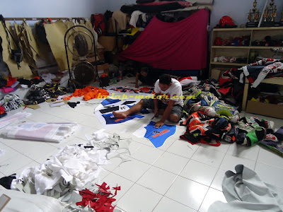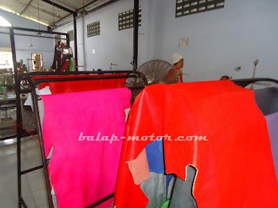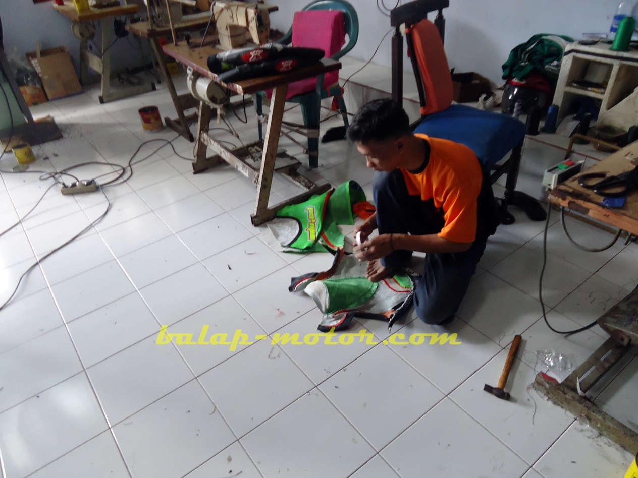 Lalu dari bagian desainer yang menentukan mau dibuat seperti apa sih wearpack tersebut, mengingat Ardian’s hanya memproduksi wearpack sesuai pesanan. Setelah sudah ada desainya, tinggal proses pengguntingan pola dari bahan kulit tadi sesuai desainya. bersamaan dengan itu ada juga bagian yang kerjanya membuat pola-pola untuk tulisan-tulisan yang akan ditempel ke baju balap itu, ada yang digunting membentuk huruf, ada juga yang disablon. Biasanya untuk yang disablon tersebut merupakan untuk mebuat pola produk sponsor team balap. Maklum pihak sponsor kan maunya merk dagang yang diiklanin kelihatan jelas.