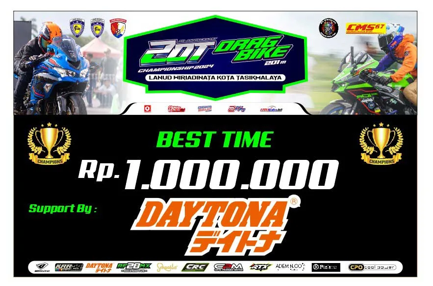 BalapMotor.Net – Gelaran balap ZOT Drag Bike 201M siap digelar di Lanud Wiriadinata, Tasikmalaya pada 29-30 Juni 2024. Brand sparepart asal Jepang yaitu Daytona ikut mensupport gelaran ini.